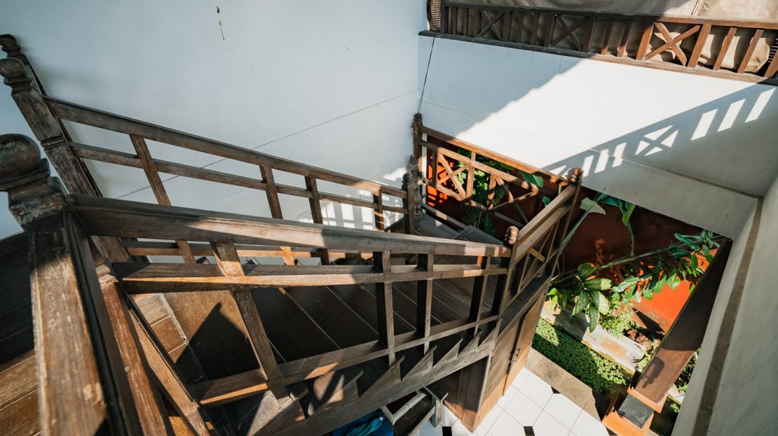Adjacent to the kitchen, there is a bedroom with its own private bathroom. Ascending to the first floor reveals two additional bedrooms.