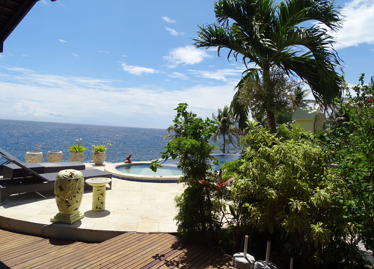 There is an oval-shaped infinity pool with an additional children’s section and a large sun deck directly in front of the ocean, offering breathtaking views of the Bali Sea and Bali’s north-east coast.