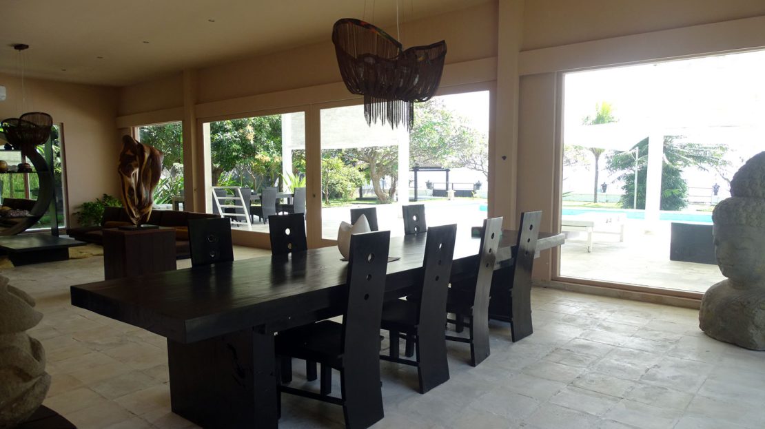 A large open dining and living area with a large glass front to the pool and ocean offers breathtaking 180 degree views over the beautiful lush tropical garden to the Bali Sea.