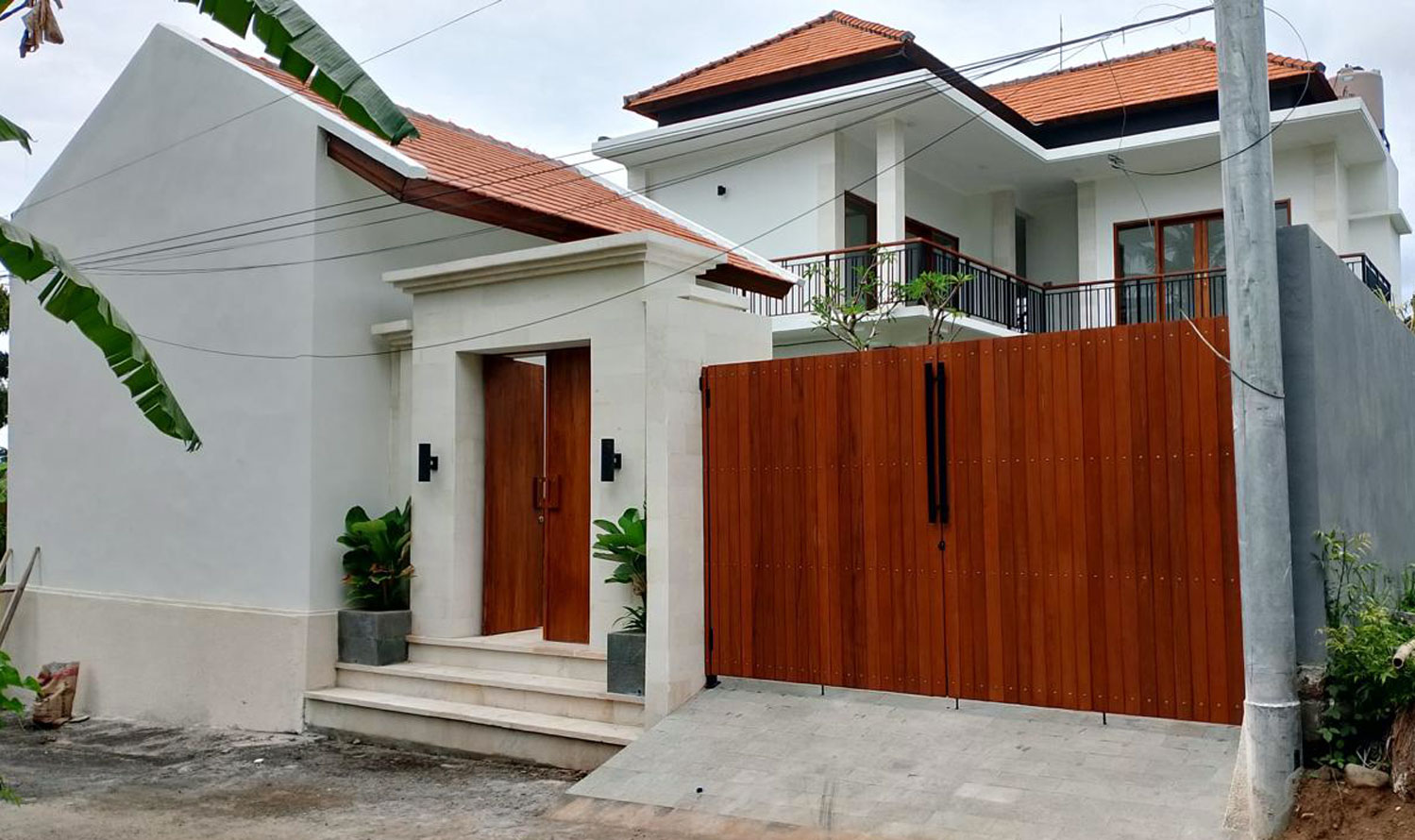 The property is walled and gated for privacy and is partially furnished. One bedroom, the kitchen, and the living area are on the ground floor, while the master bedroom and one additional guest bedroom are on the first floor.