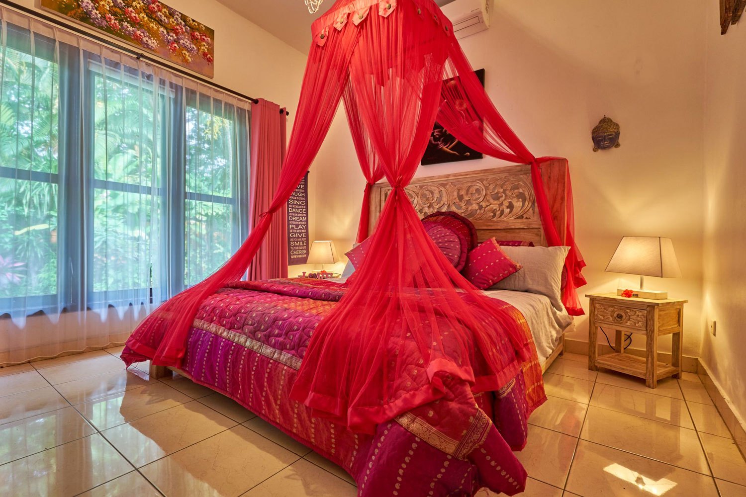 The cottage building is beautifully set in the front yard of the property, immersed in the lush tropical garden, and offers an additional bedroom with king-size bed & shower unit, and a spacious terrace with loungers.